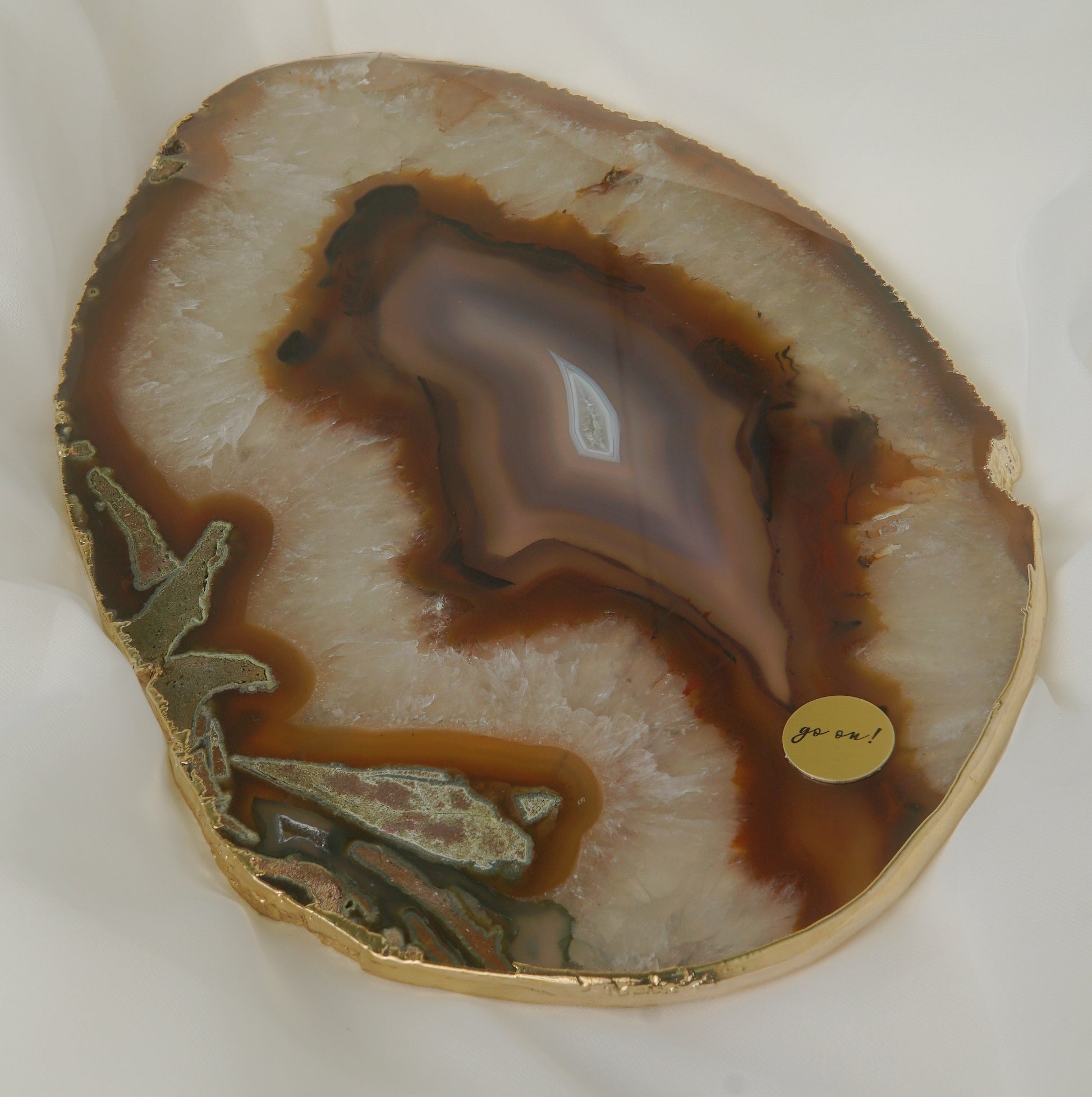 Chapa de ágata fina polida, no tom caramelo com cristalização, com acabamento em banho de ouro. Possui proteção de silicone na parte inferior da peça.