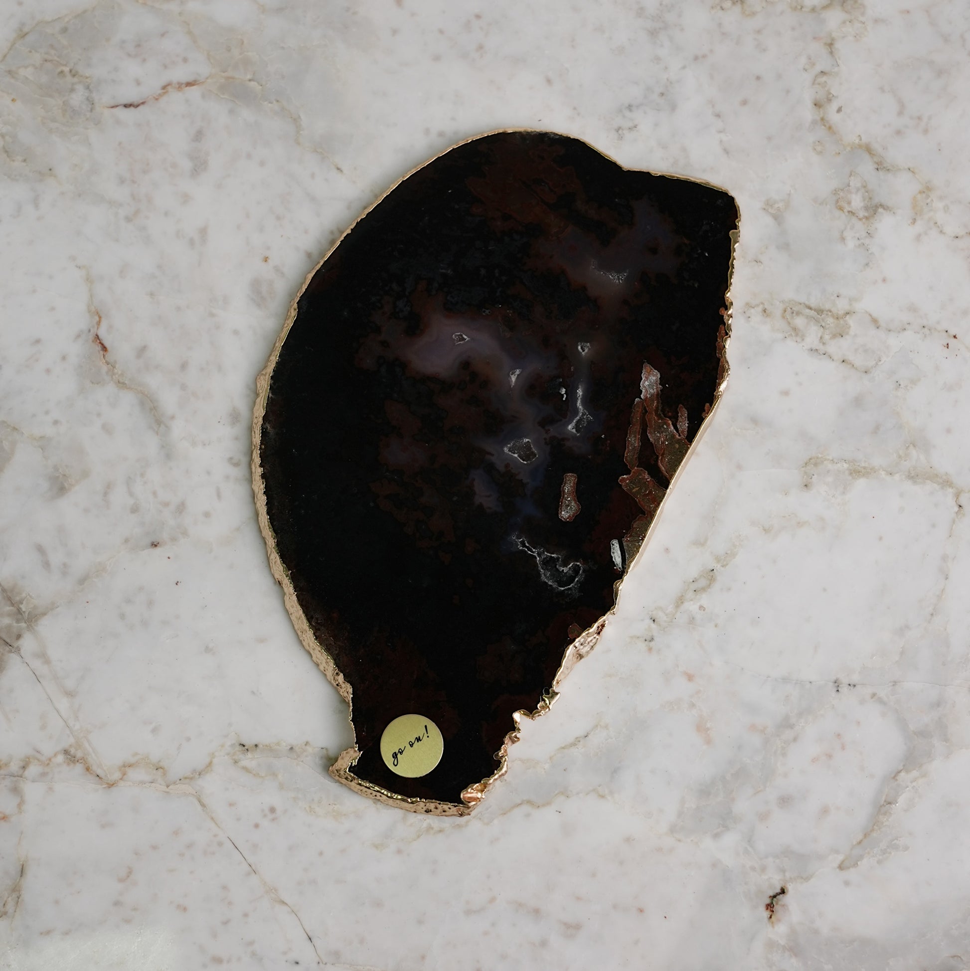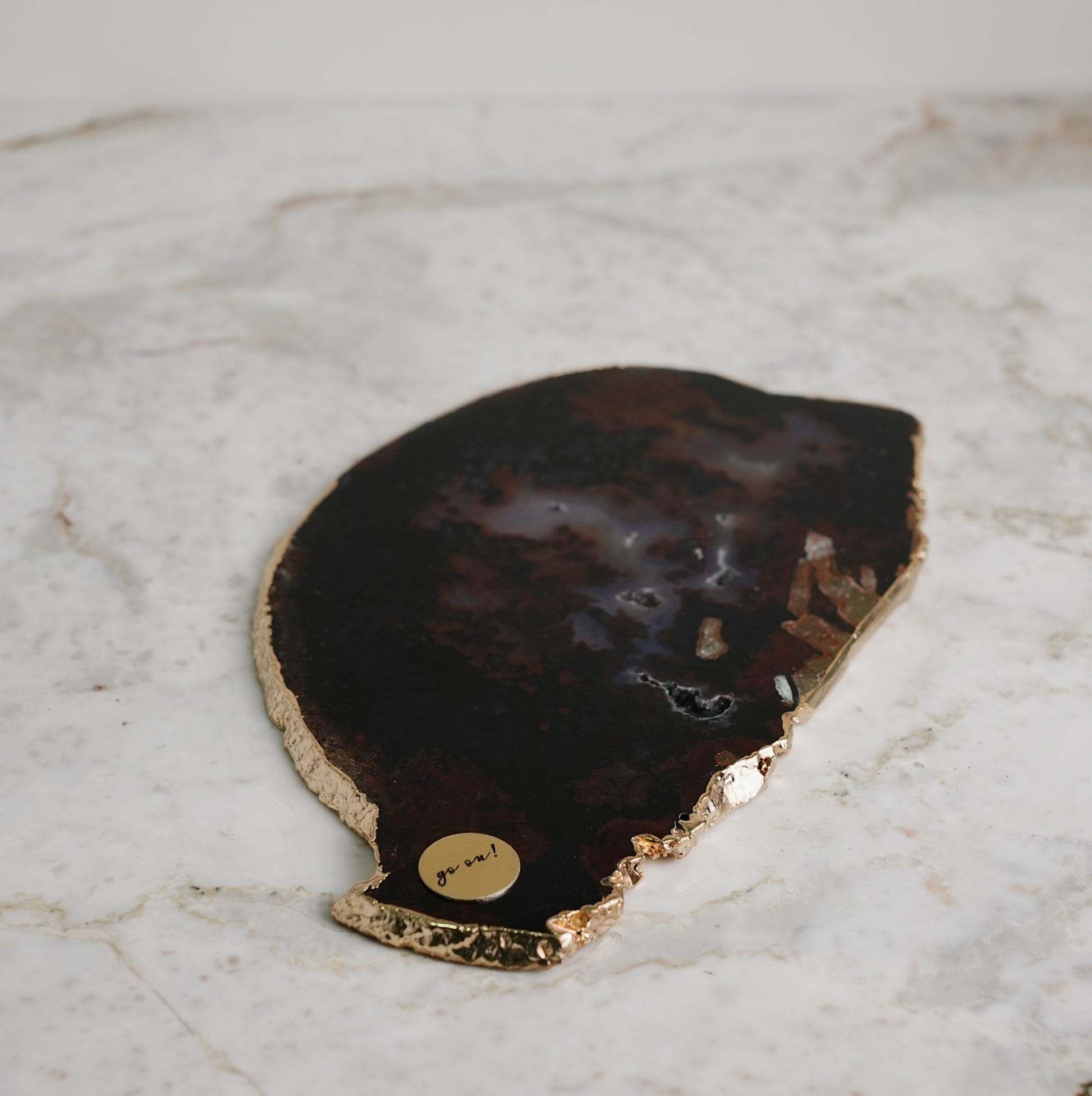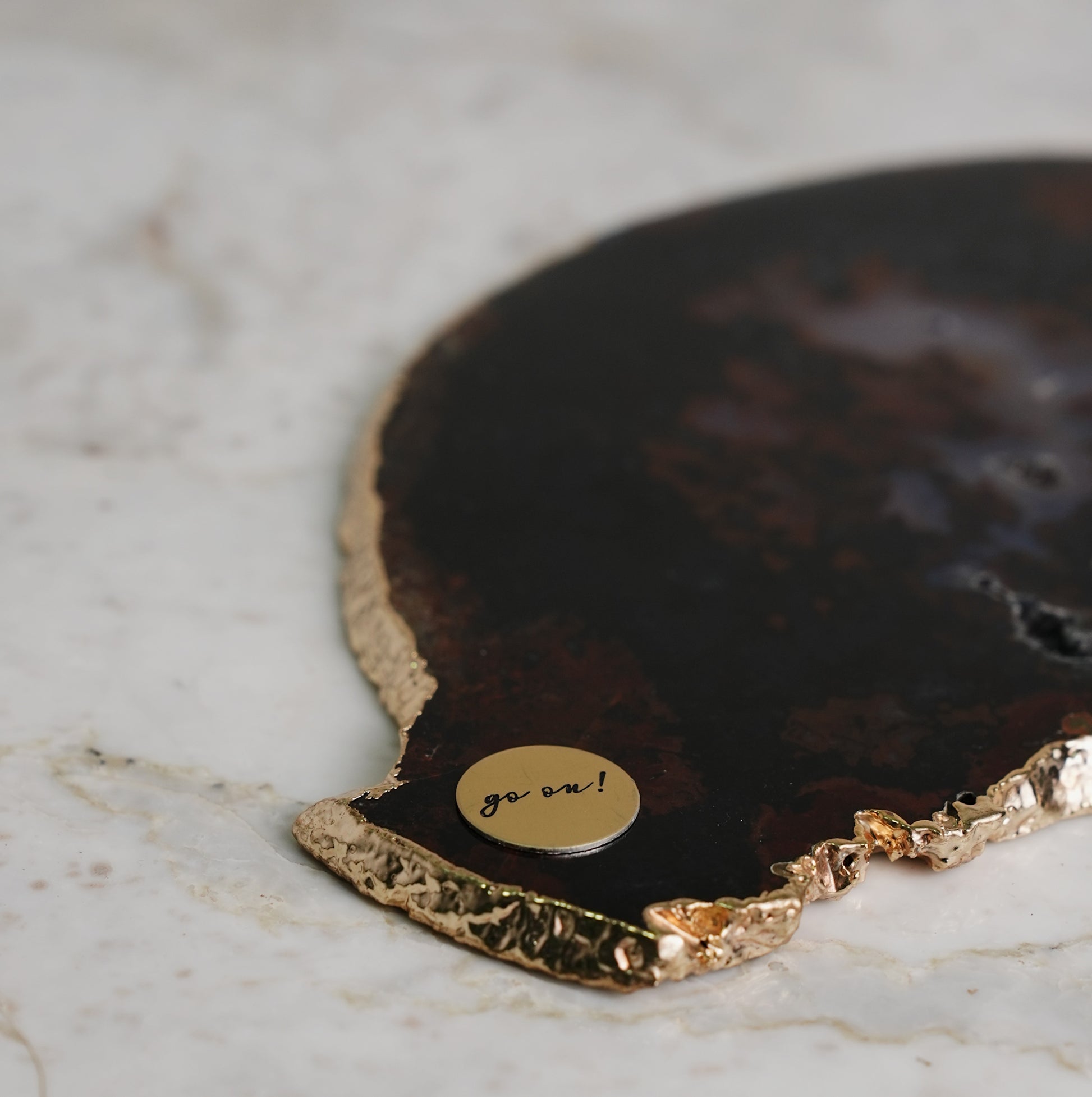 Chapa de ágata fina polida, no tom preto com pontos avermelhados, com acabamento em banho de ouro. Possui proteção de silicone na parte inferior da peça.