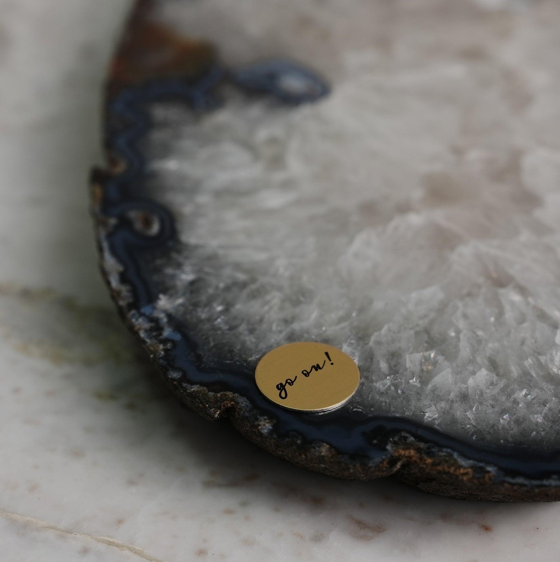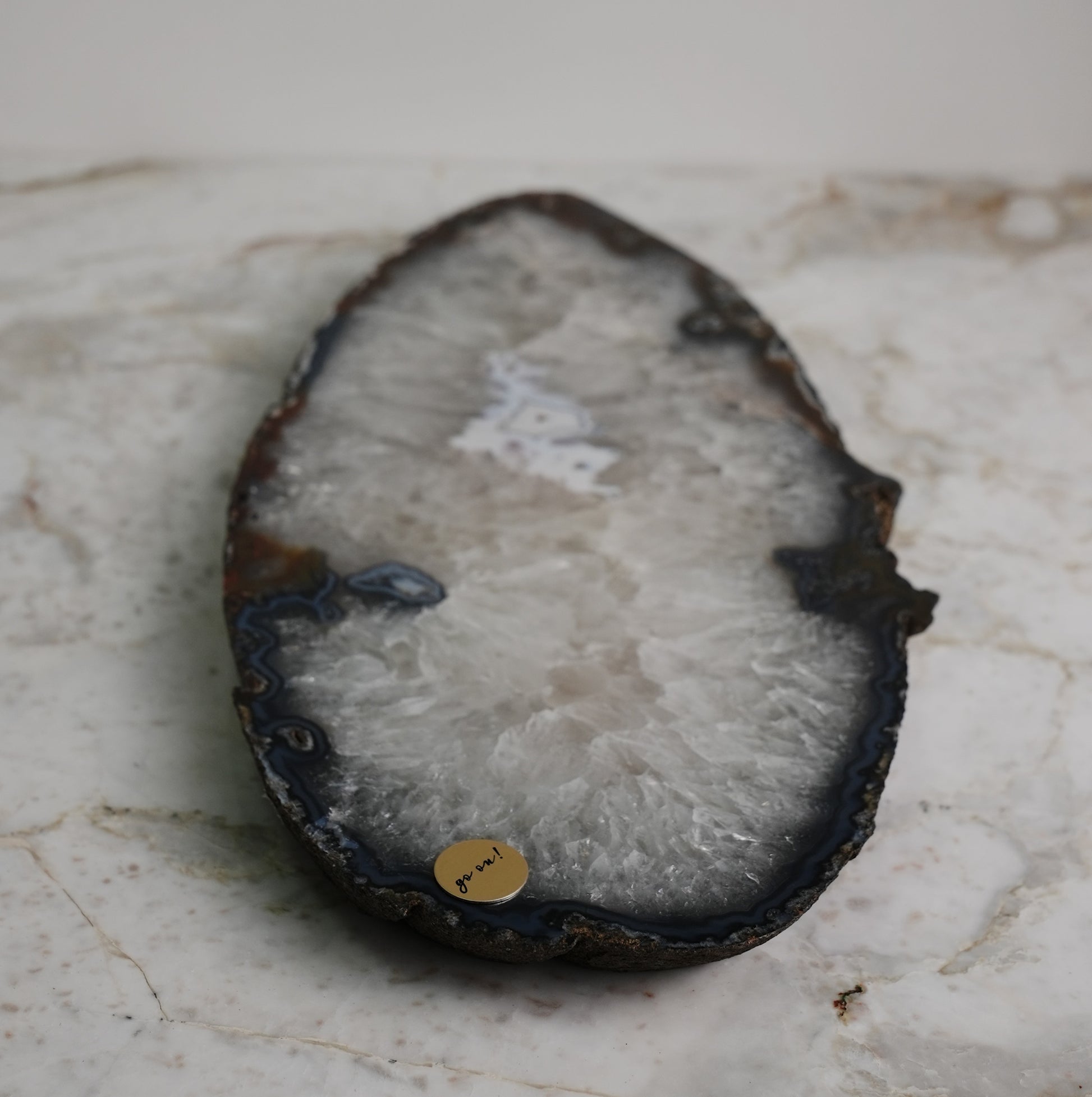Chapa de ágata grossa com cristalização. Com acabamento natural, mas é possível personalizar e adicionar a finalização em folha de ouro - entre em contato para mais informações +55 (43) 99833-0552. Possui proteção de silicone na parte inferior da peça.