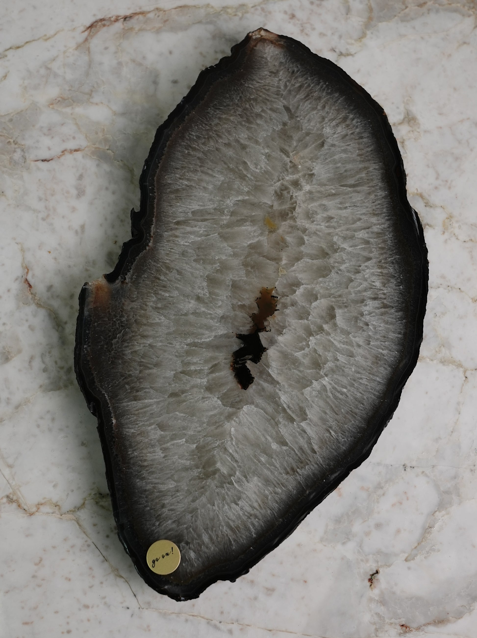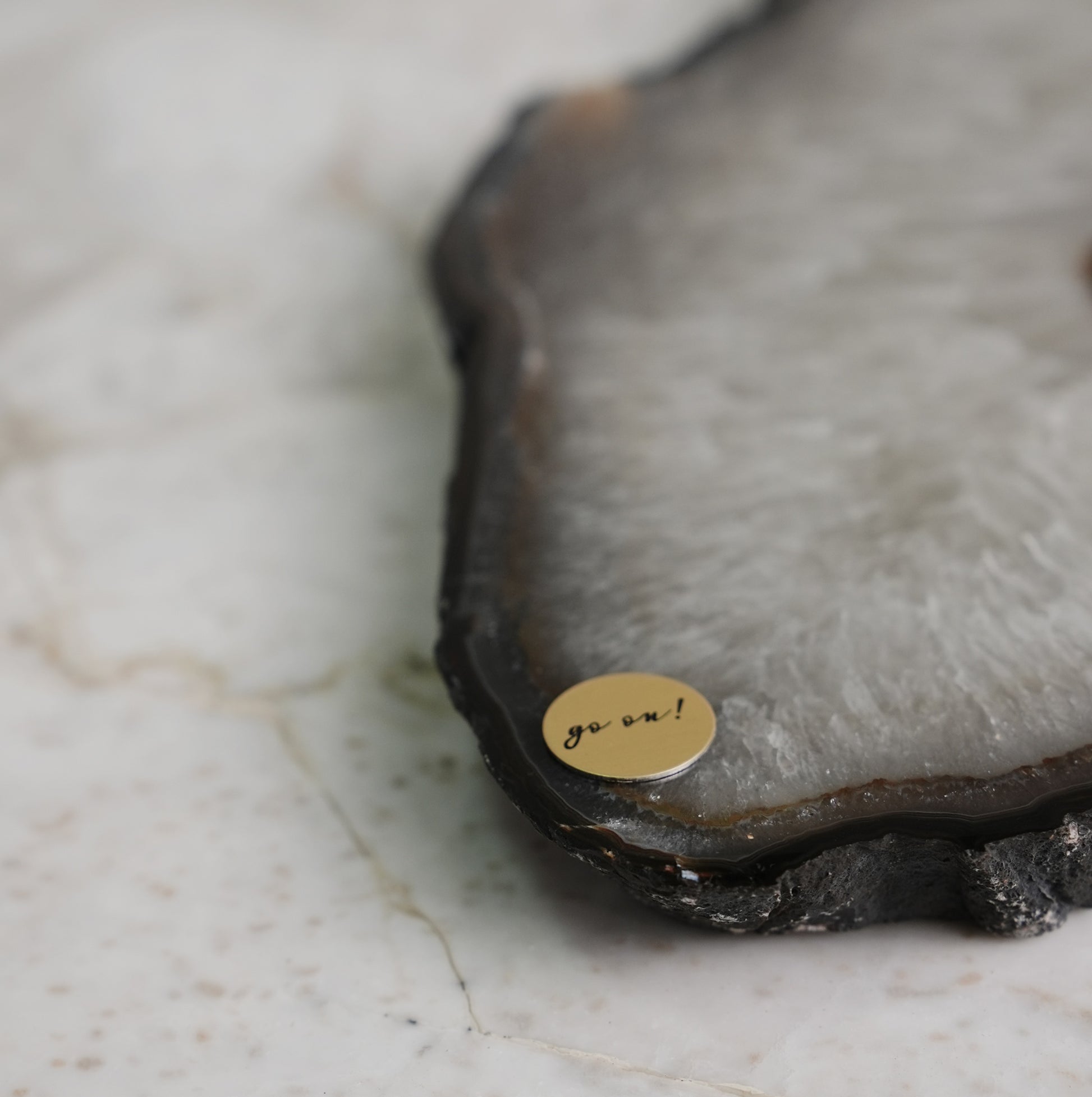 Chapa de ágata grossa com cristalização. Com acabamento natural, mas é possível personalizar e adicionar a finalização em folha de ouro - entre em contato para mais informações +55 (43) 99833-0552. Possui proteção de silicone na parte inferior da peça.