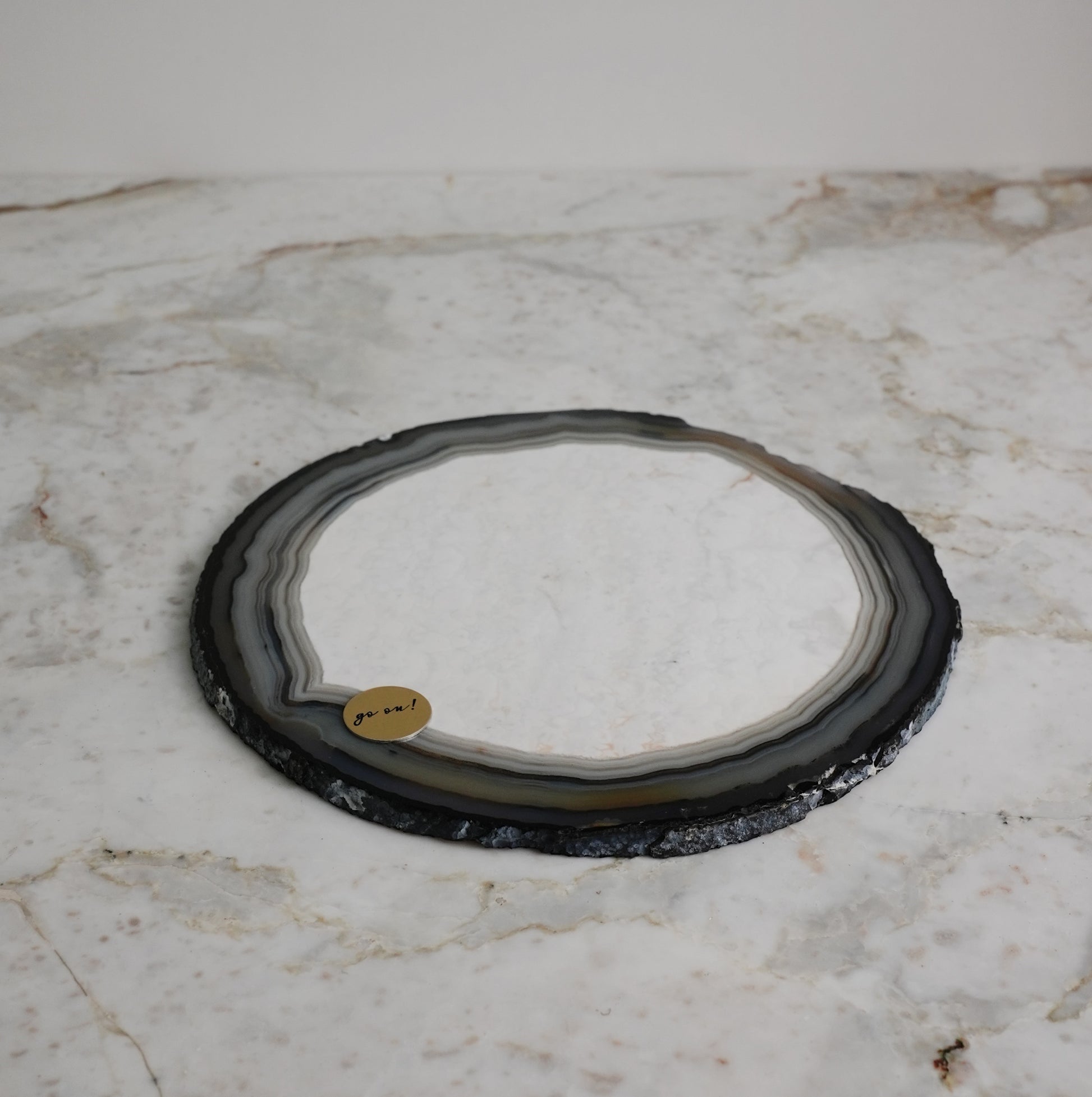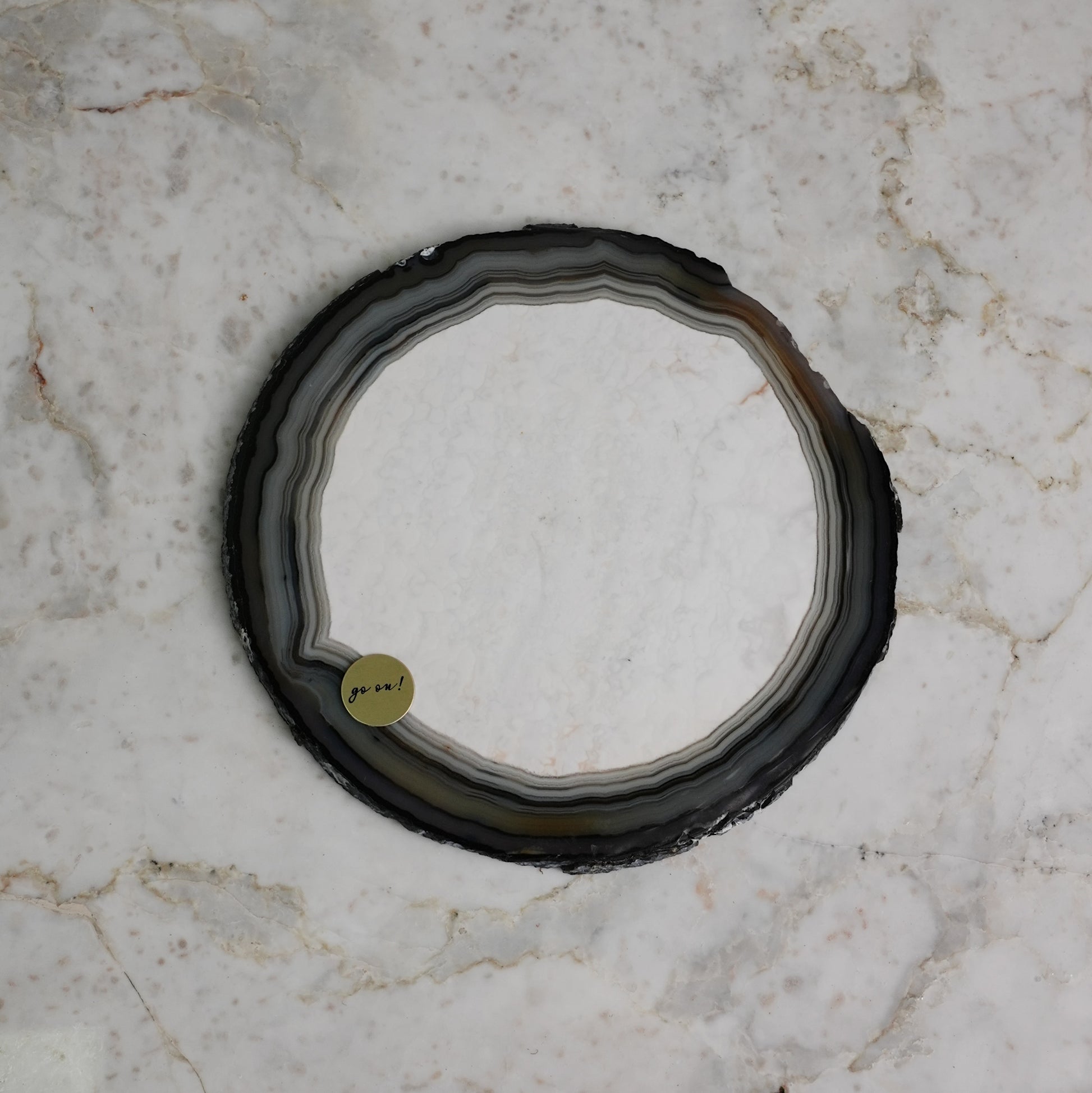 Chapa de ágata fina polida no tom preto, cinza e branco, na qualidade e padronagem super especial . Com acabamento natural, mas é possível personalizar e adicionar a finalização em folha de ouro - entre em contato para mais informações +55 (43) 99833-0552. Possui proteção de silicone na parte inferior da peça.