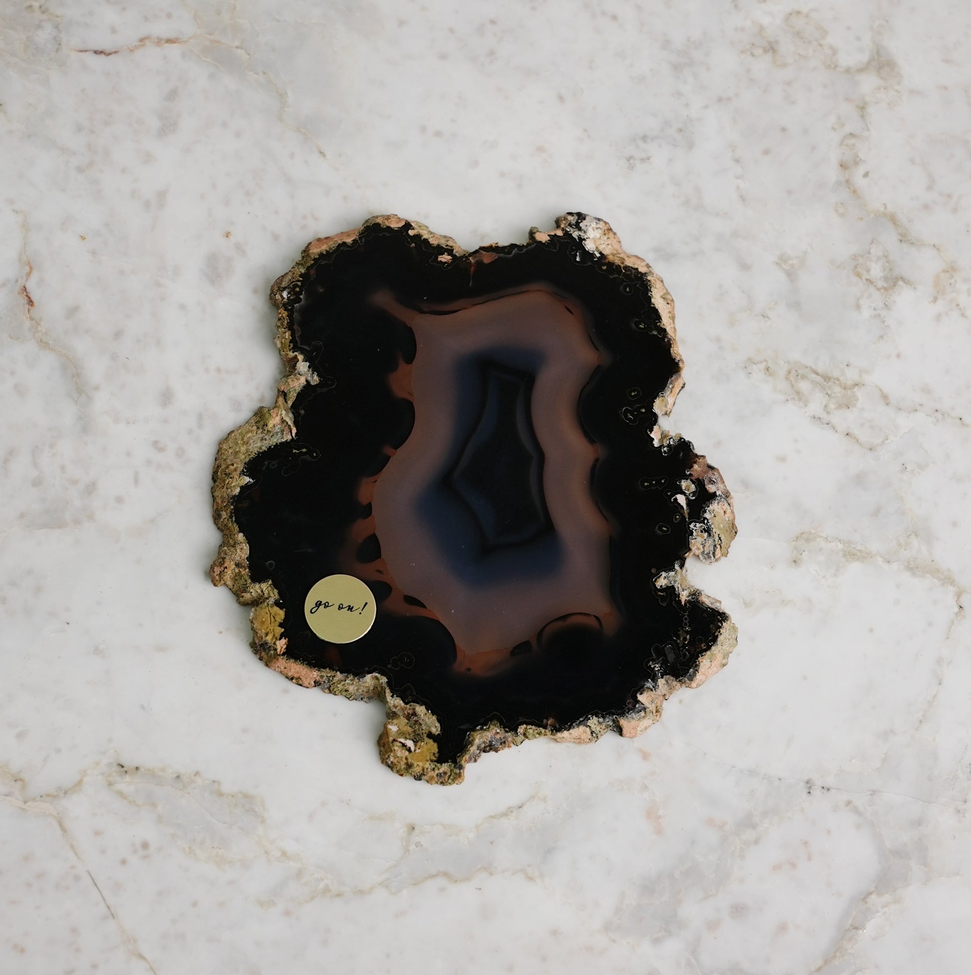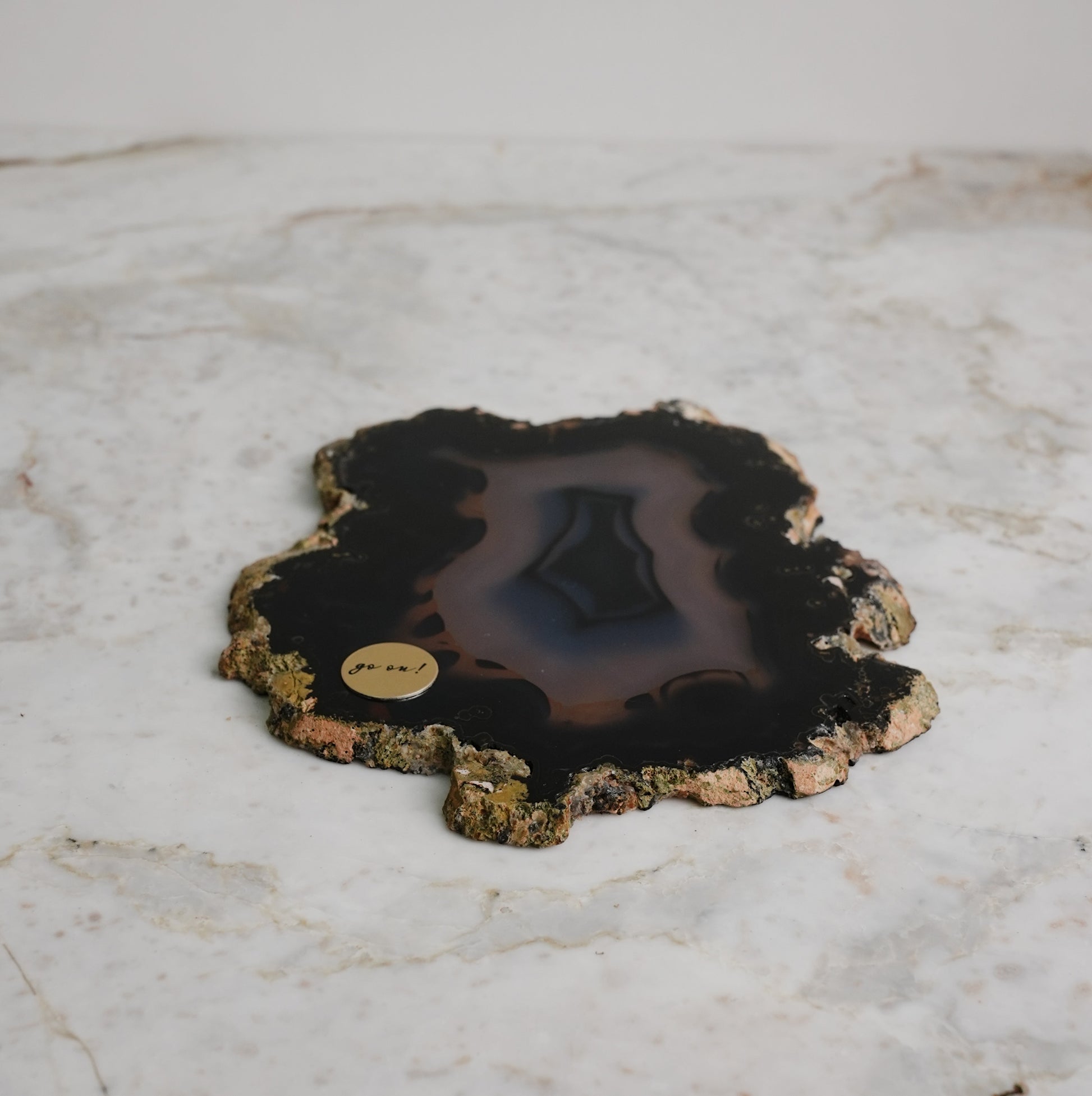 Chapa de ágata fina polida no tom preto e transparência, formato exótico. Com acabamento natural, mas é possível personalizar e adicionar a finalização em folha de ouro - entre em contato para mais informações +55 (43) 99833-0552. Possui proteção de silicone na parte inferior da peça.