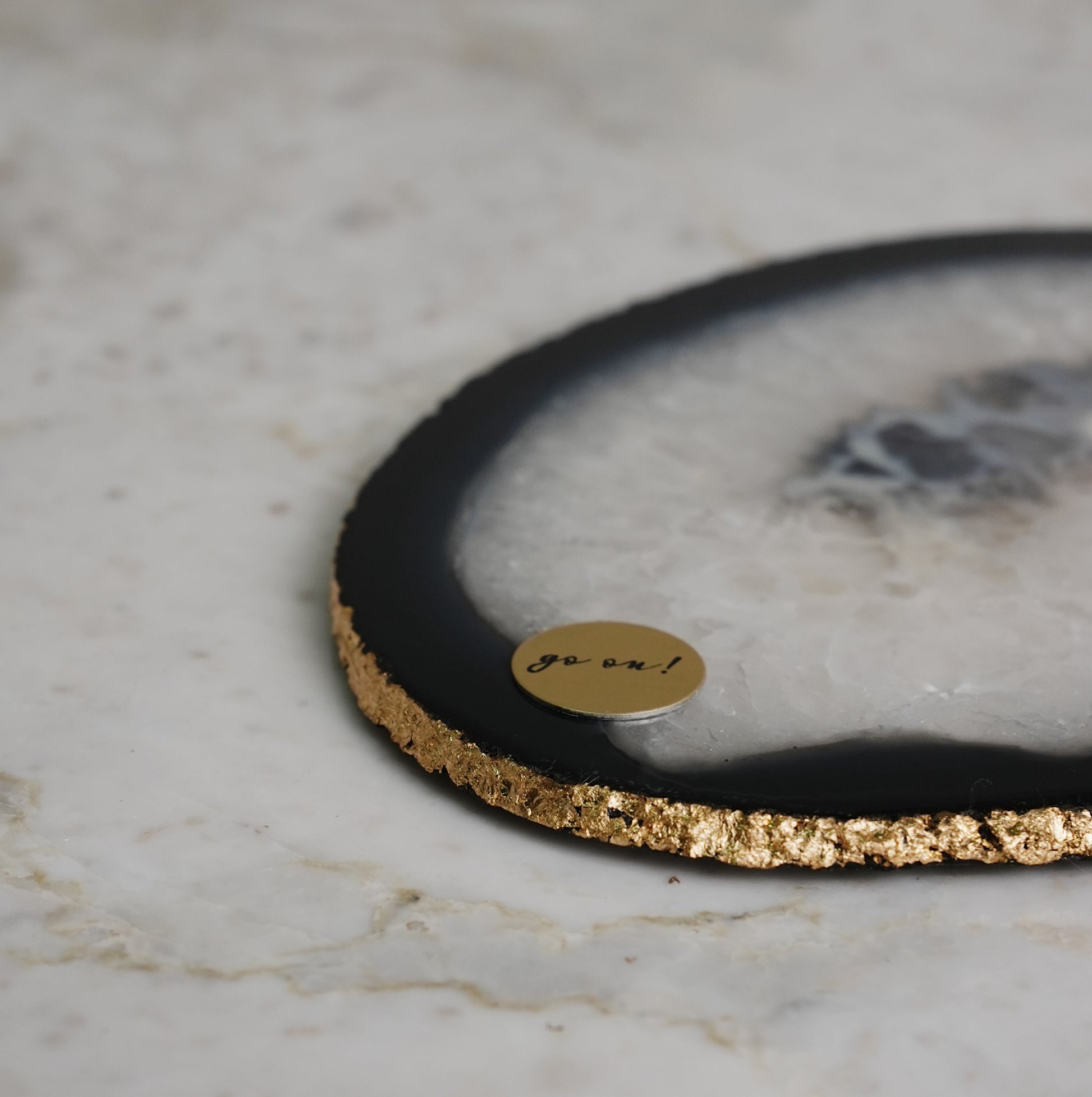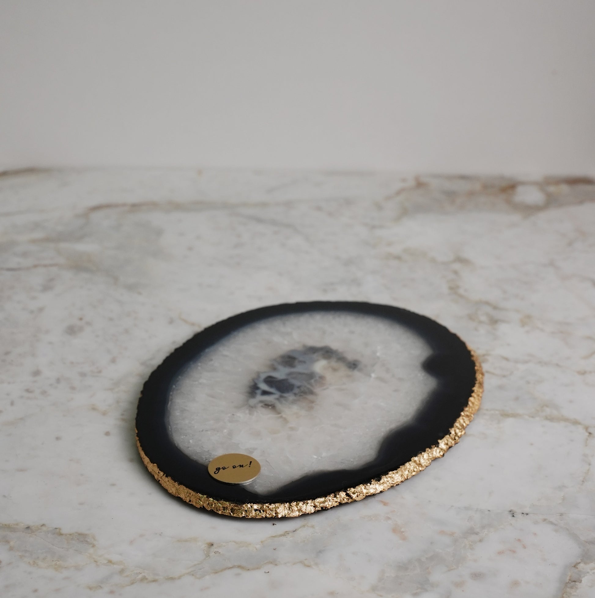 Chapa de ágata fina polida, com cristalização predominante e tons de azul escuro. Com acabamento em folha de ouro. Possui proteção de silicone na parte inferior da peça.