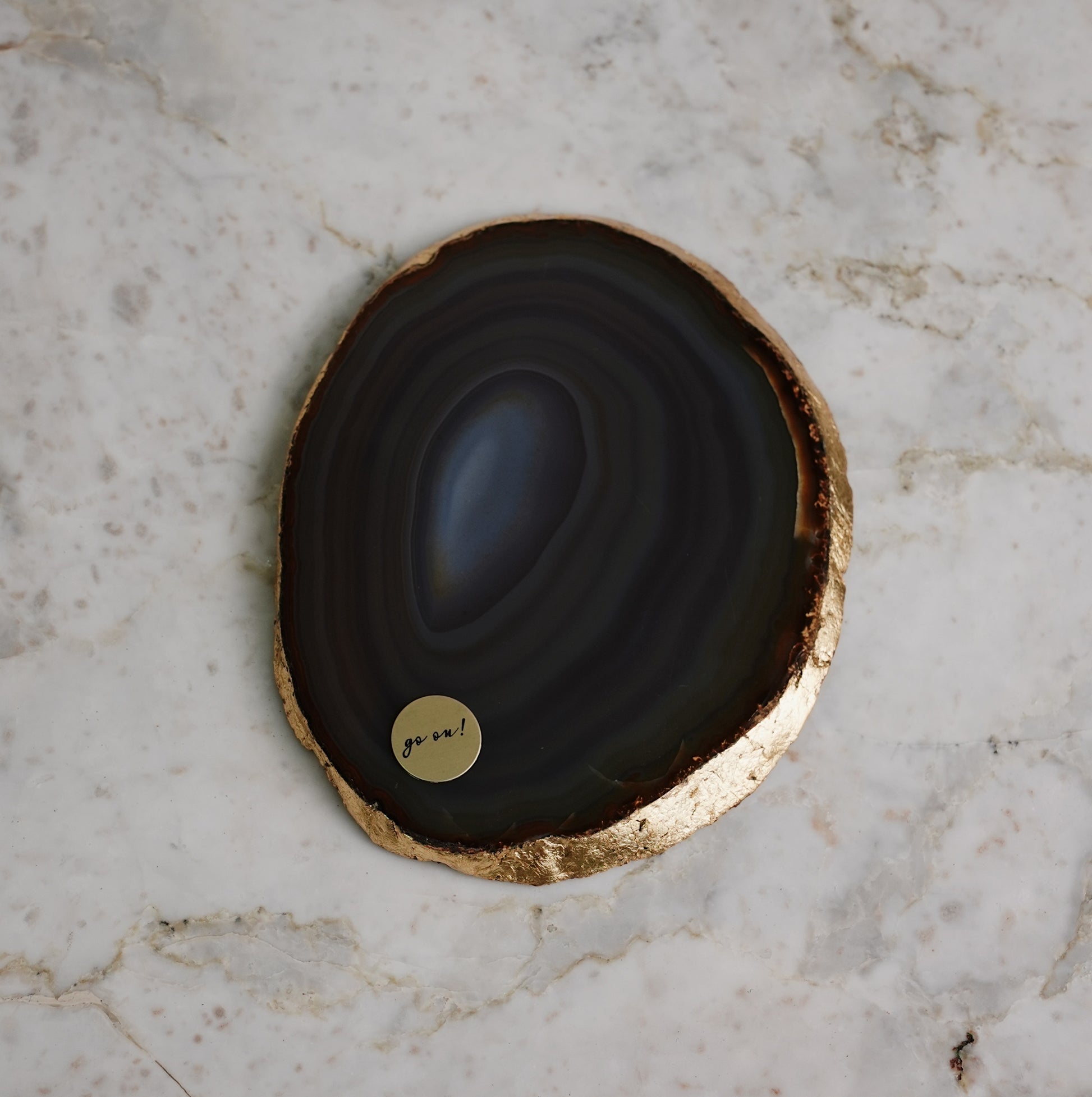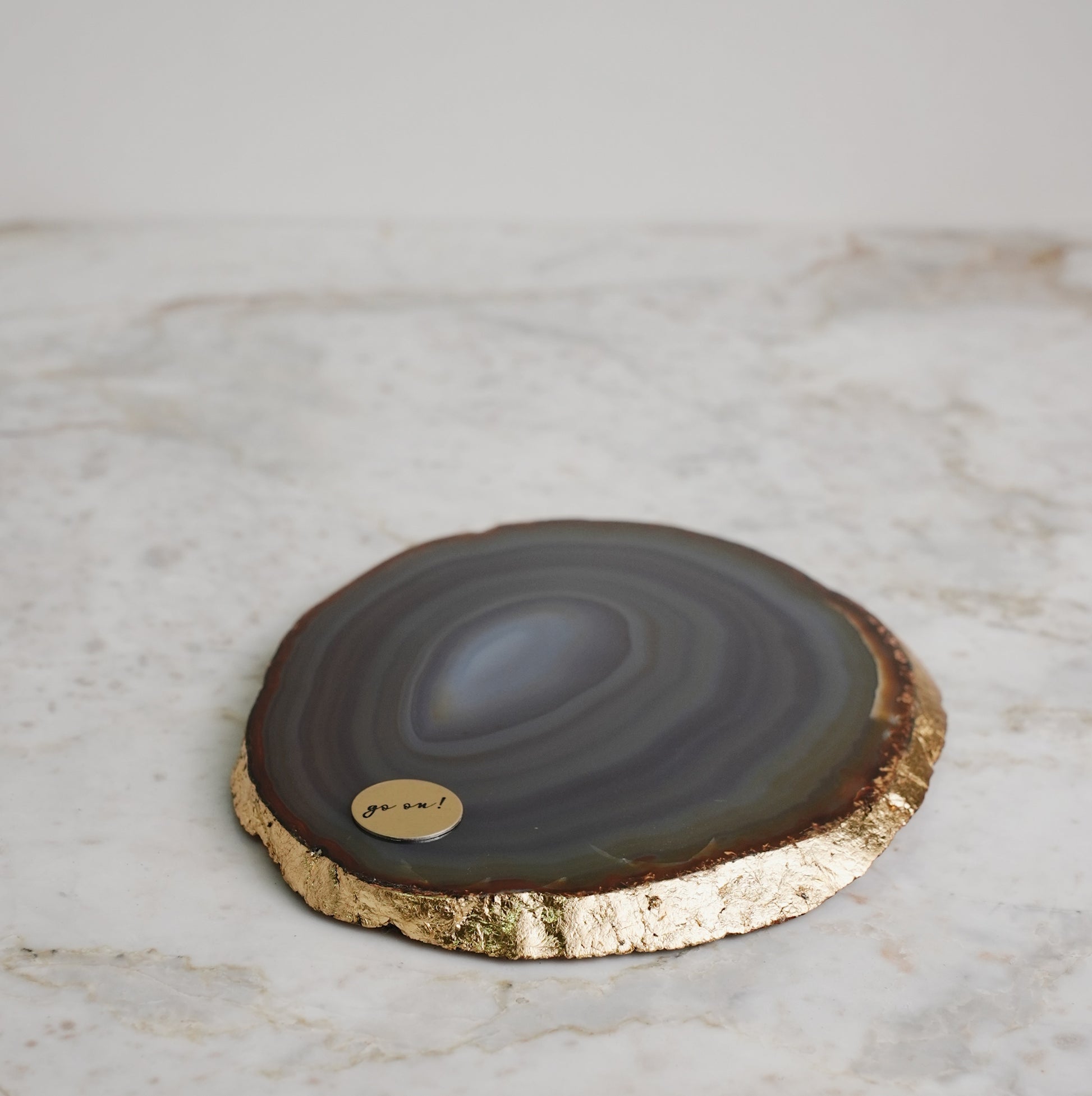 Chapa de ágata fina polida, no tom caramelo com traços no cinza, com acabamento em folha de ouro. Possui proteção de silicone na parte inferior da peça.