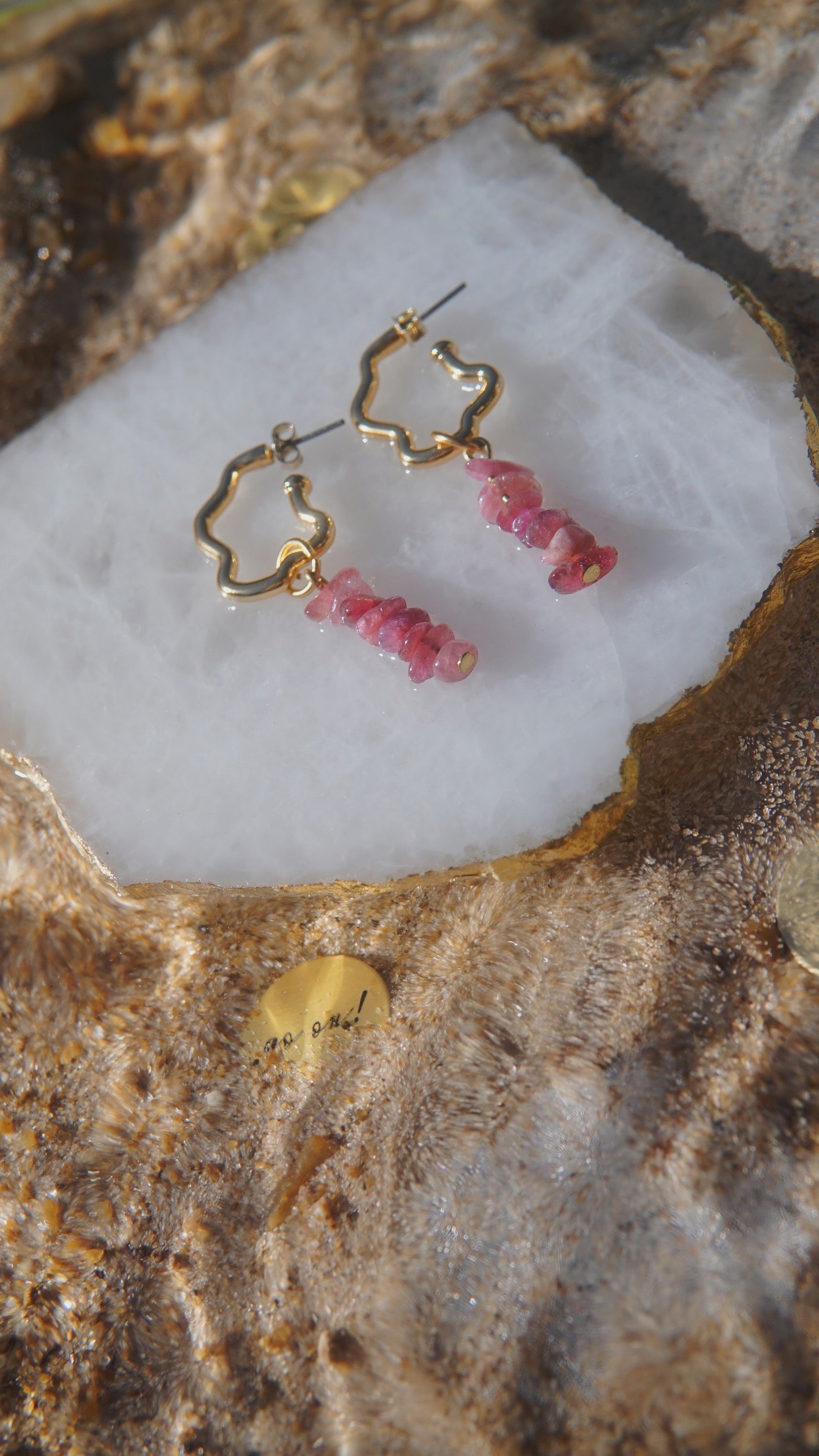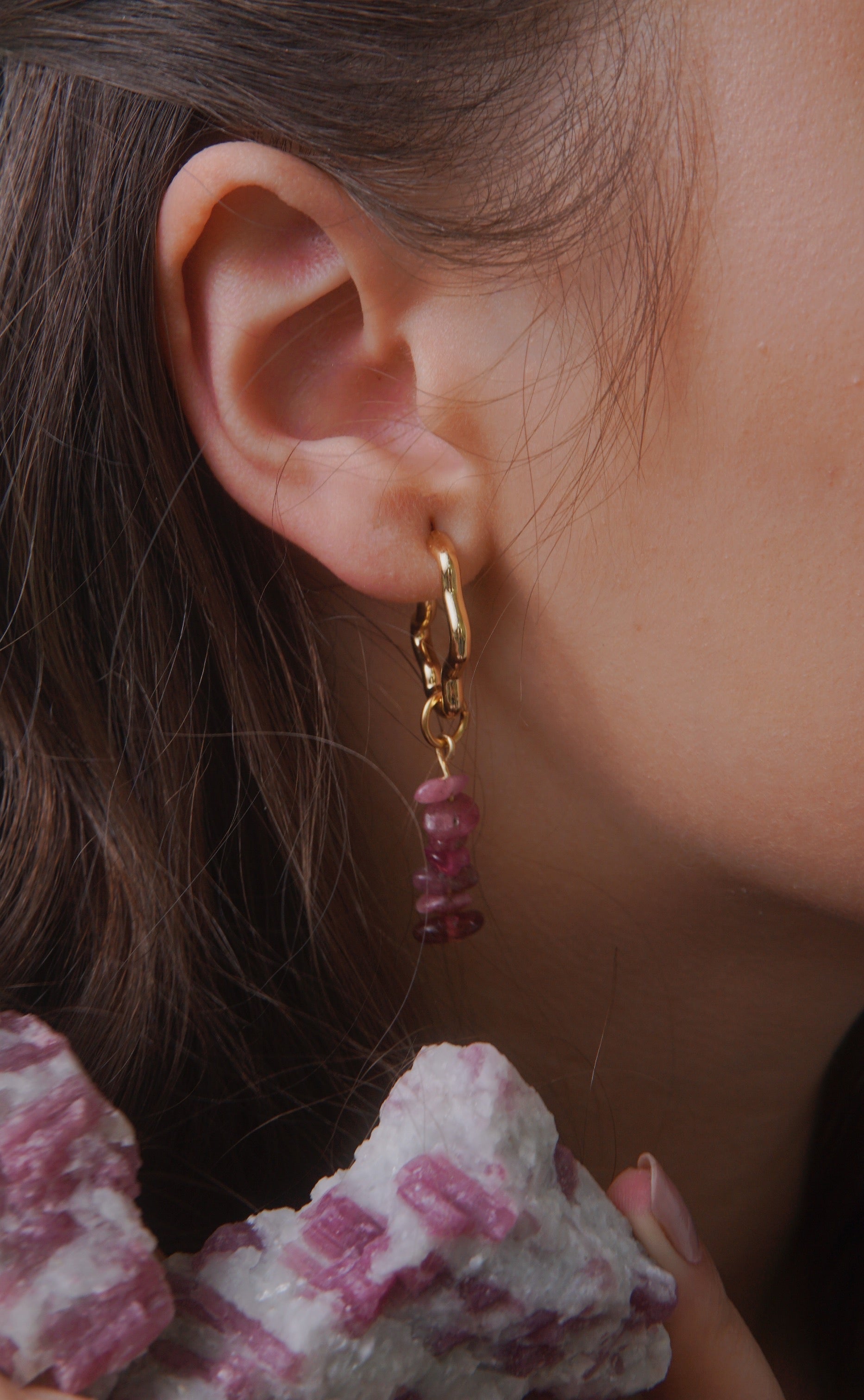 Brinco dourado em formato orgânico + par de pingentes turmalina rosa.