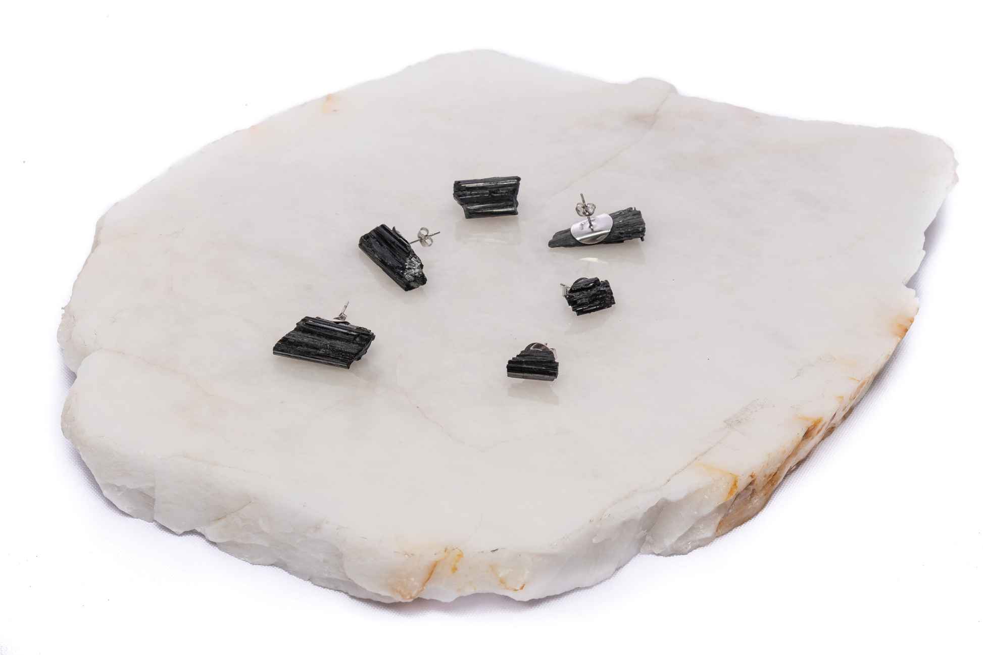 Considerada uma pedra de proteção energética, este par de brincos é feito em liga de metal e Turmalina negra bruta.