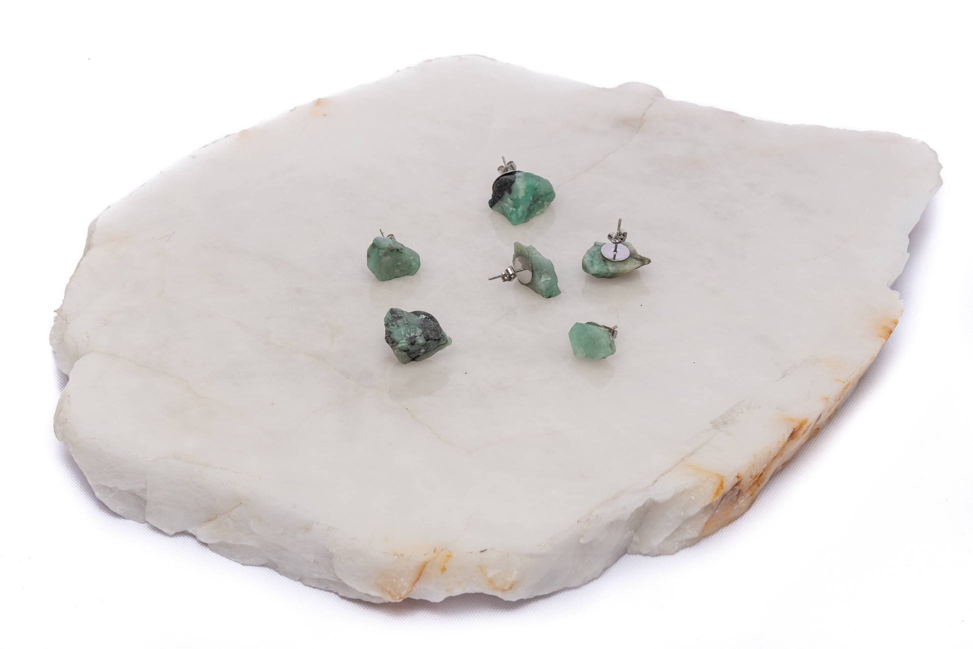 Conhecida como pedra da Prosperidade este par de brincos em liga metálica e esmeralda bruta tem aproximadamente 1 a 1,5 cm.