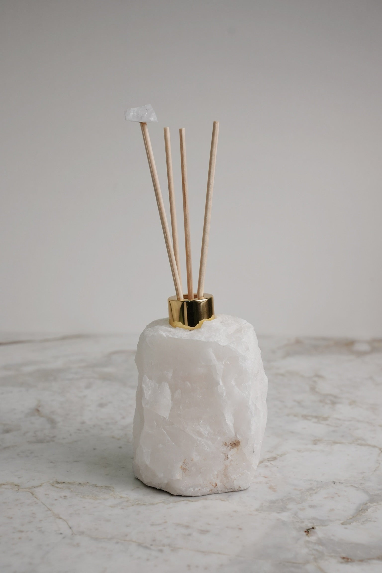 Saboneteira + Difusor esculpidos em Quartzo Branco. Acompanha varetas