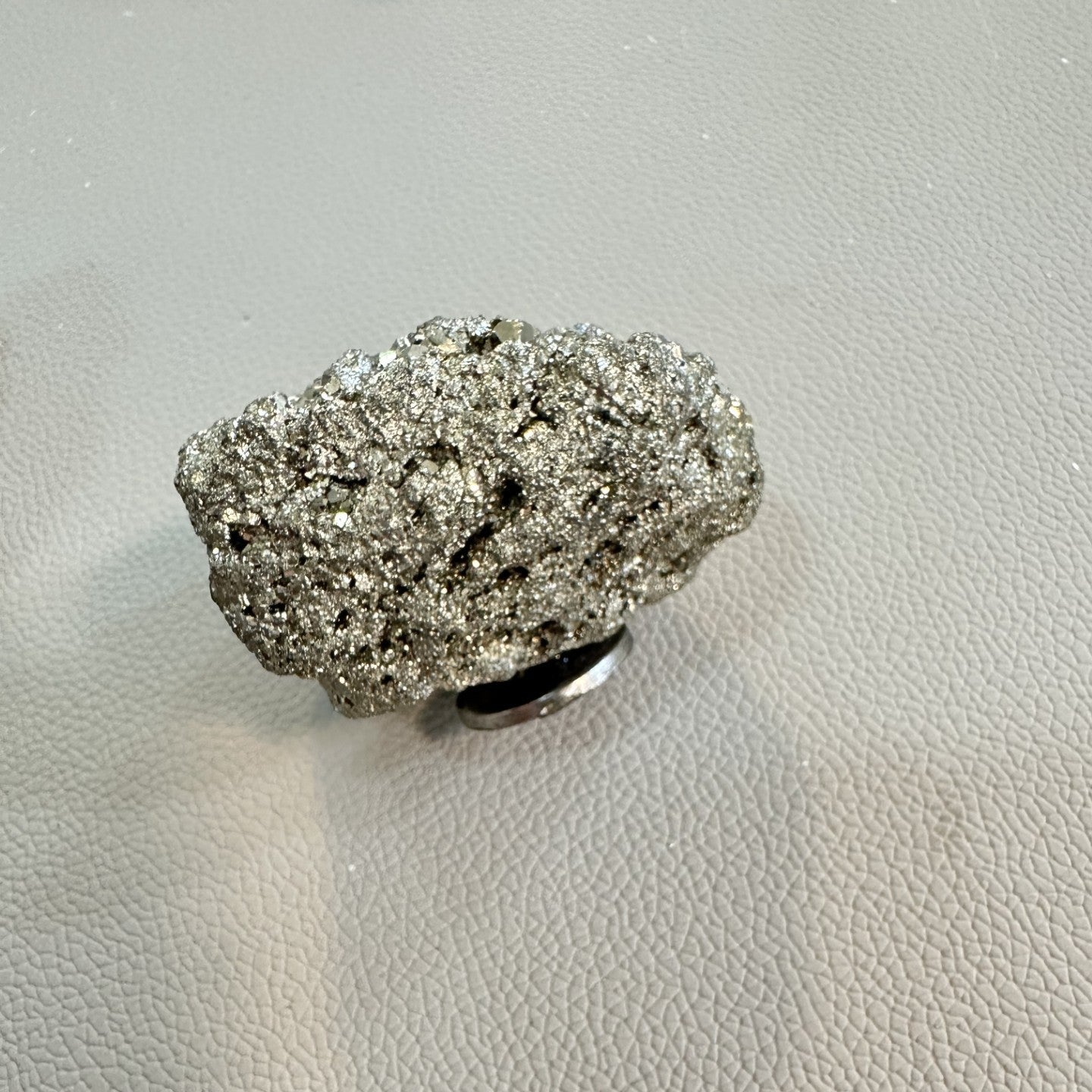 Este puxador para móveis é produzido artesanalmente em metal e pedra pirita bruta natural, combinando o brilho orgânico da pirita com a solidez do acabamento metálico. A escolha perfeita para composições sofisticadas e cheias de personalidade.